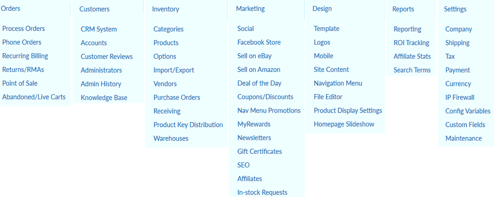 On the surface Volusion offers a set of easy to use admin pages to upload your products and process your orders, but there a lot of hidden power in Volusion. As you hover your mouse over the main navigation links you will see a large selection of choices.